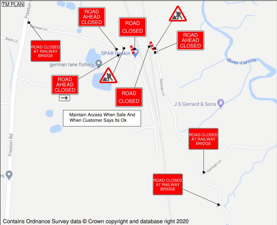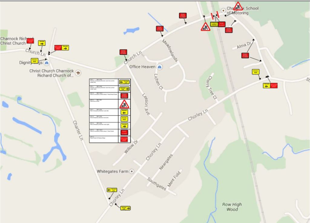 The road at the railway bridge on Church Lane will be closed between 11:30pm until 9am the folloing morning over 5 consecutive weekends as follows:-